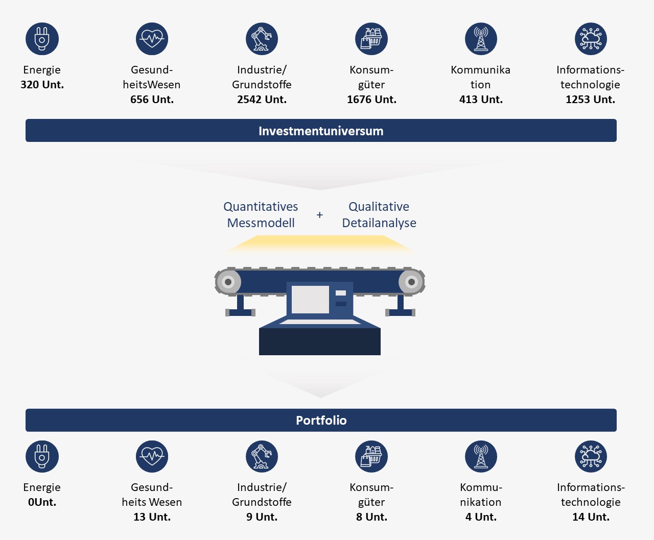 Unternehmen mit hoher Innovationsbewertung werden anschließend einer detaillierten Fundamentalanalyse unterzogen. Dabei werden unter anderem Ertragskraft, Wachstum, Free-Cash-Flow-Generierung, Verschuldung, Bewertung, Wettbewerbsposition sowie ESG-Kriterien analysiert. Die Innovationsbewertung wird somit durch eine klassische Qualitäts- und Bewertungsprüfung ergänzt.